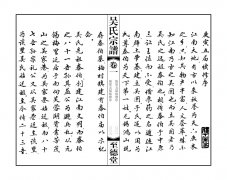 卷一(卷首):吳氏圖騰、題詞、泰伯座像無錫鴻山泰伯墓、無錫泰伯廟、籌委會名錄、功德榜、大學生一覽表、譜序、凡例、記、詩詞、跋卷二:奉天敕命、像贊、制服圖、傳、續修凡例人口統計表卷三:先祖序傳、民國版老譜領譜字號、吳氏世系說、歷屆續修宗譜記錄、源流世系、卷四:統宗世系世表、卷五:統宗世系表、編后記、領譜字號。